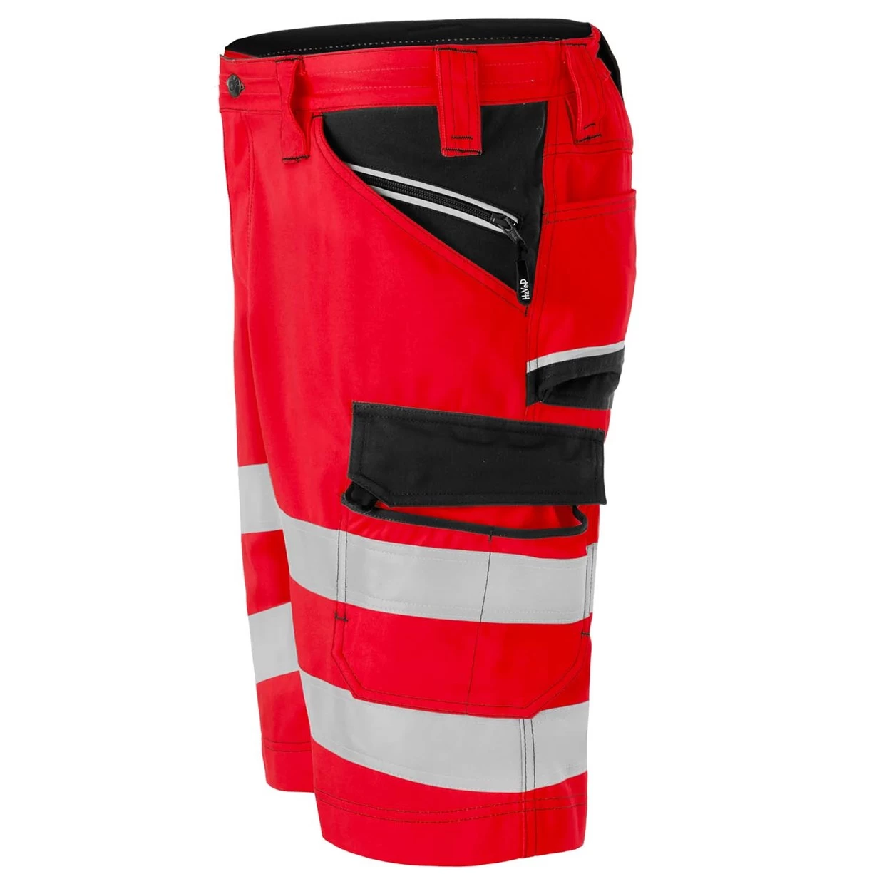 HaVeP korte broek met verdekte ritssluiting, 2 ingezette ruime zijzakken met extra ingezette zak, waarvan 1 afsluitbaar met rits, 2 ruime achterzakken, loshangende duimstokzak met 2 extra zakken, ruime loshangende dijbeenzak met klep en drukknoop met extra opbergmogelijkheden, elastiek in rug, 1 D-ring voor badgehouder, reflectieband, reflecterende piping.