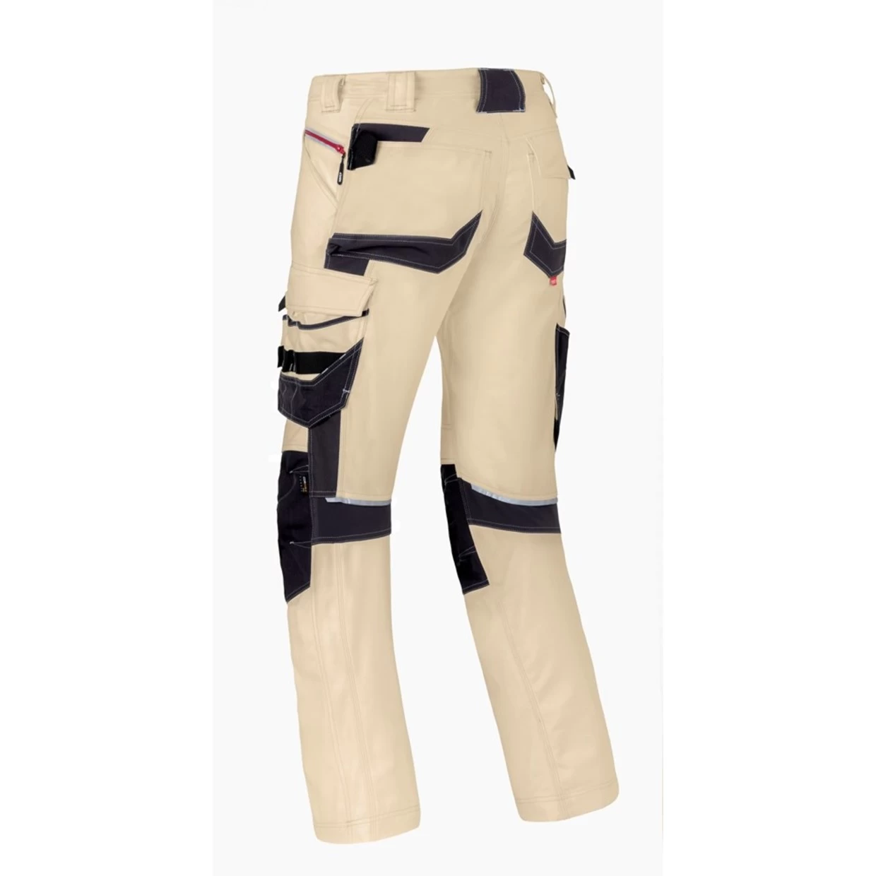 verdekte ritssluiting, 2 ruime ingezette zijzakken waarvan 1 extra zakje met rits, 2 ruime achterzakken waarvan 1 met klep, loshangende duimstokzak met extra toolzakjes, ruime loshangende dijbeenzak met klep en extra opbergmogelijkheden door de geïntegreerde GSM-zak en de extra toolzakjes, makkelijk toegankelijke Cordura® kniezakken met opening aan bovenzijde afsluitbaar met klep en klittenband, voorgevormde broekspijpen voor zeer goede pasvorm, Cordura® versterkingen en drievoudig gestikte naden op kwetsbare plekken voor een extra lange levensduur, brede riemlussen, verstelbare hamerlus d.m.v. drukknoop, zeer sterk ademend stretch doek (polyamide/Lycra) in de knieholte voor optimaal draagcomfort, extra inzet bij kruis ter voorkoming van uitscheuring, 1 D-ring voor badgehouder, reflecterende piping
